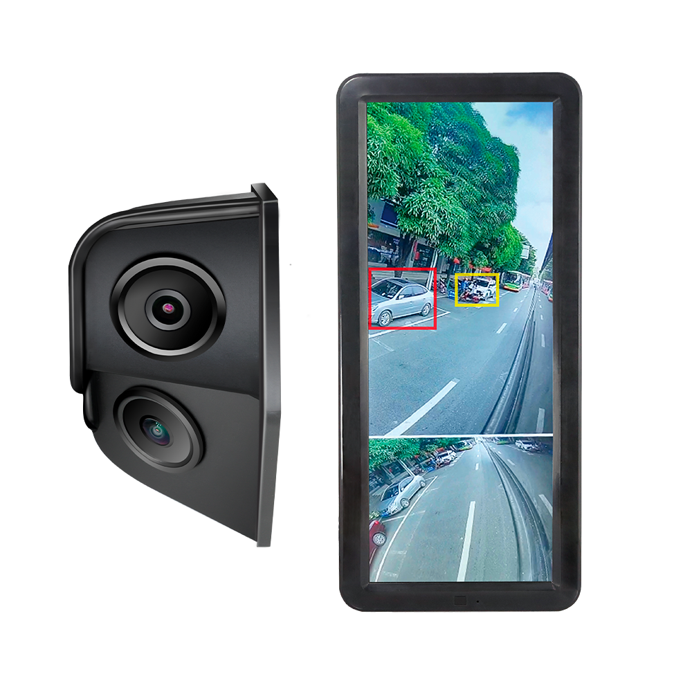 Kit completo de retro visión y ángulo muerto izquierdo, se compone de monitor y cámara dual con resolución 2MPx. Pantalla IPS con BLC y brillo automático para cualquier condición lumínica. Protección de cámara IP69K con WDR. Rango de voltaje de 10 a 32V.