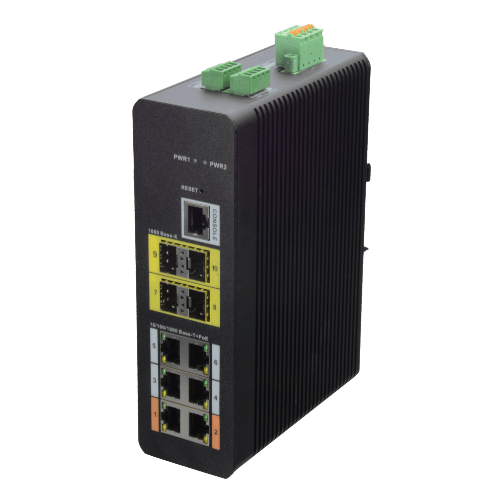 - 6 puertos PoE (RJ45) + 4 puerto Uplink (SFP)